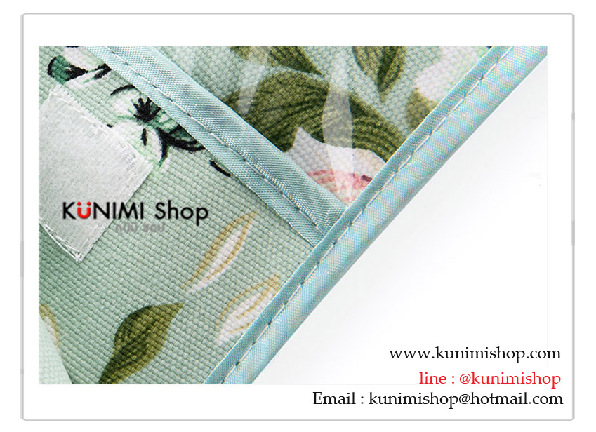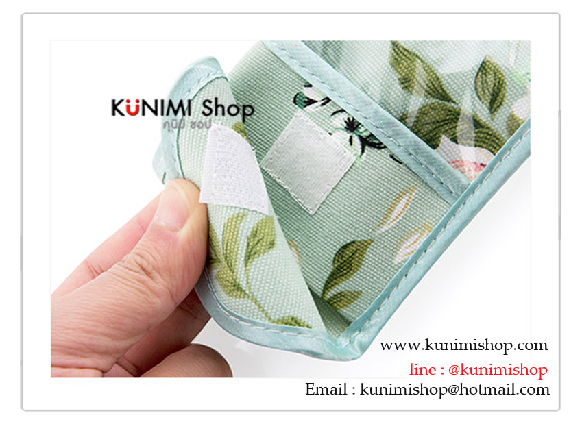ตัวซองทำจากผ้า ส่วนด้านหน้าเป็นพลาสติกใส เปิด - ปิด ด้วยแถบตีนตุ๊กแก
